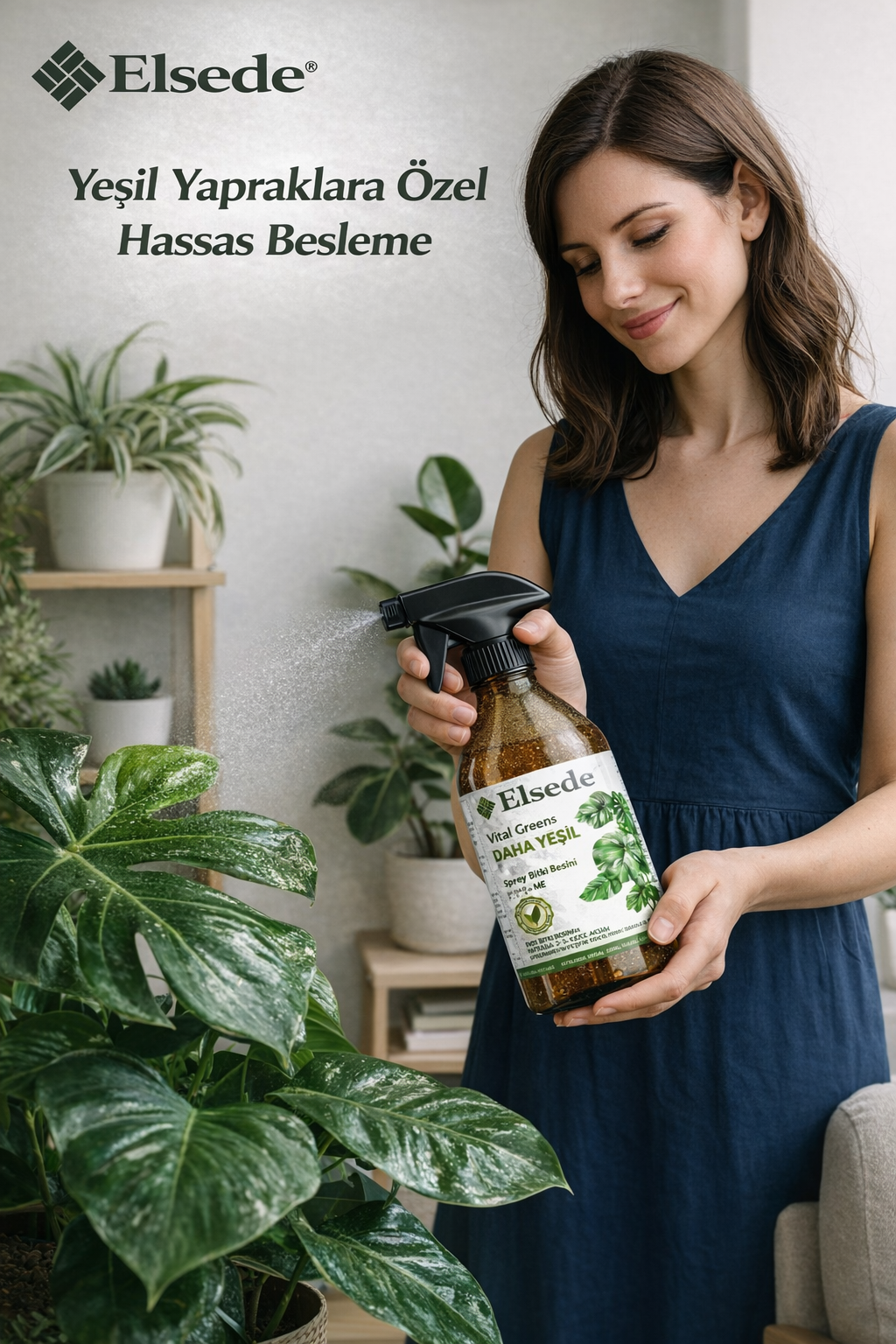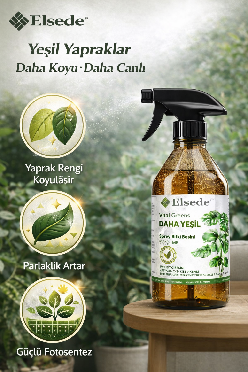 Elsede VitalGreens, yeşil yapraklı süs bitkilerinin daha canlı, parlak ve koyu yeşil olmasını için geliştirilmiş, gelişim dönemlerinde ihtiyaç duyduğu tüm besinleri karşılamak üzere özel olarak formüle edilmiştir.  Sıvı Bitki Besinidir. Bitkilerin doğal gelişim ritmine uygun bu özel formül; kontrollü büyümeyi desteklerken, Dengeli içeriği sayesinde yeşil yapraklı bitkilerde güvenle kullanılabilir